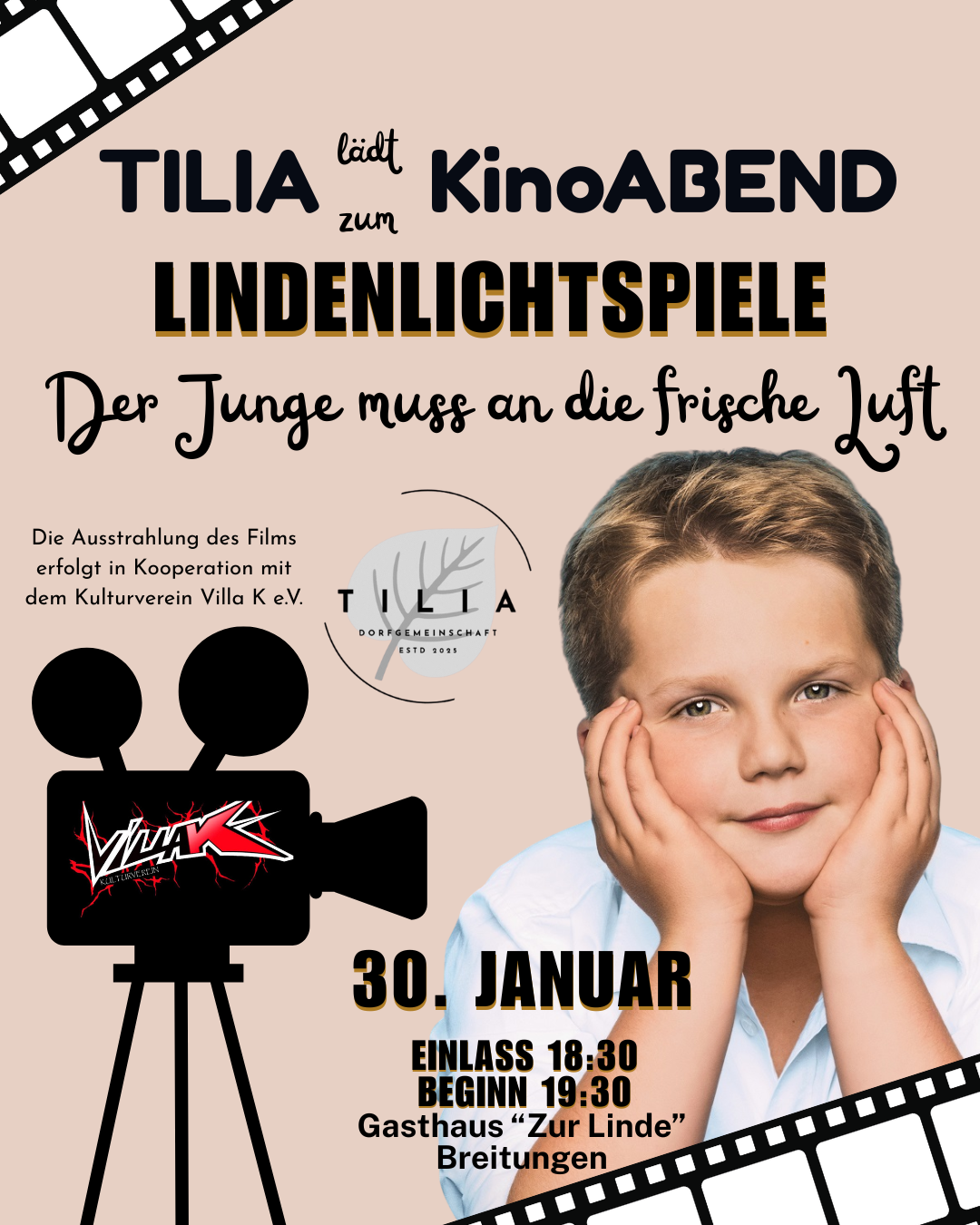 Die Tilia Dorfgemeinschaft lädt herzlich zum nächsten Lindenlichtspiele-Kinoabend ein. Am Freitag, den 30. Januar 2026, verwandelt sich der Saal des Gasthaus „Zur Linde“ in Breitungen in ein gemütliches Kino. Film des Abends: „Der Junge muss an die frische Luft“ – die bewegende und humorvolle Verfilmung der Kindheit von Hape Kerkeling. Der Film erzählt die… Lindenlichtspiele der Tilia Dorfgemeinschaft – Filmabend am 30. Januar 2026